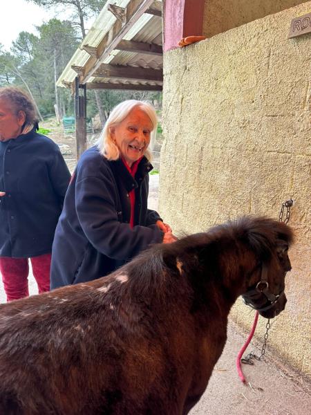 Les résidents participent régulièrement à des sorties en équithérapie, un moment très attendu par tous. Au contact des chevaux, chacun peut profiter d’un instant de détente, de douceur et de partage dans un cadre apaisant.